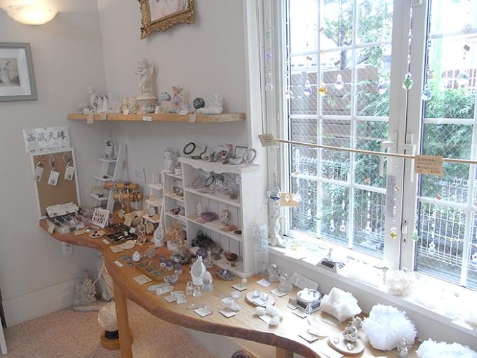 原石や置石、天使の置物、オラクルカードなども取り扱っています。自分用のアクセサリー制作から贈り物選びまで、天然石に親しみながら楽しめるお店です。