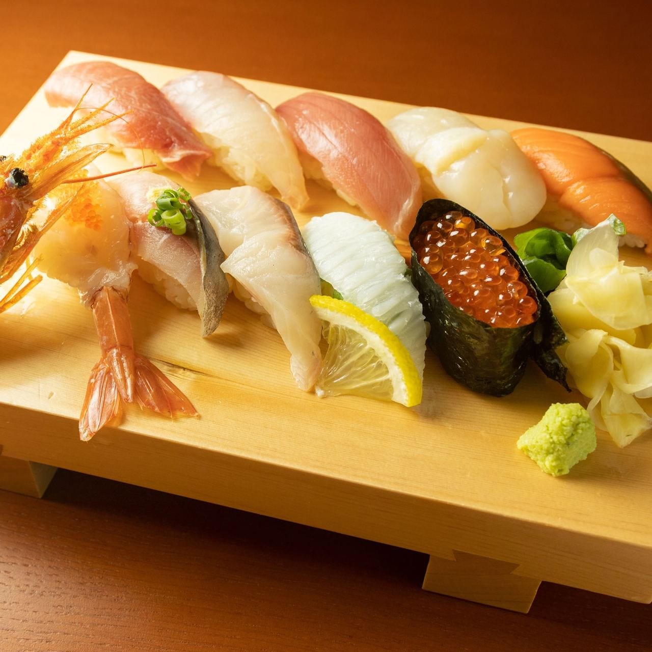 店内は、温かい木目調のインテリアと落ち着いた照明のモダンな空間。