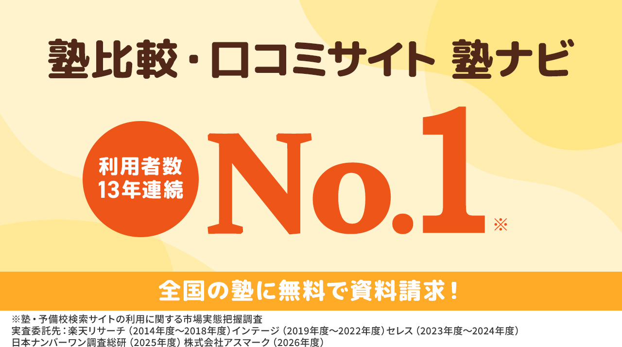 「塾ナビ」は学習塾や予備校を、口コミや各種ランキングなどの豊富なコンテンツを元に簡単に検索比較・資料請求できる利用者数13年連続No.1*のサイトです。