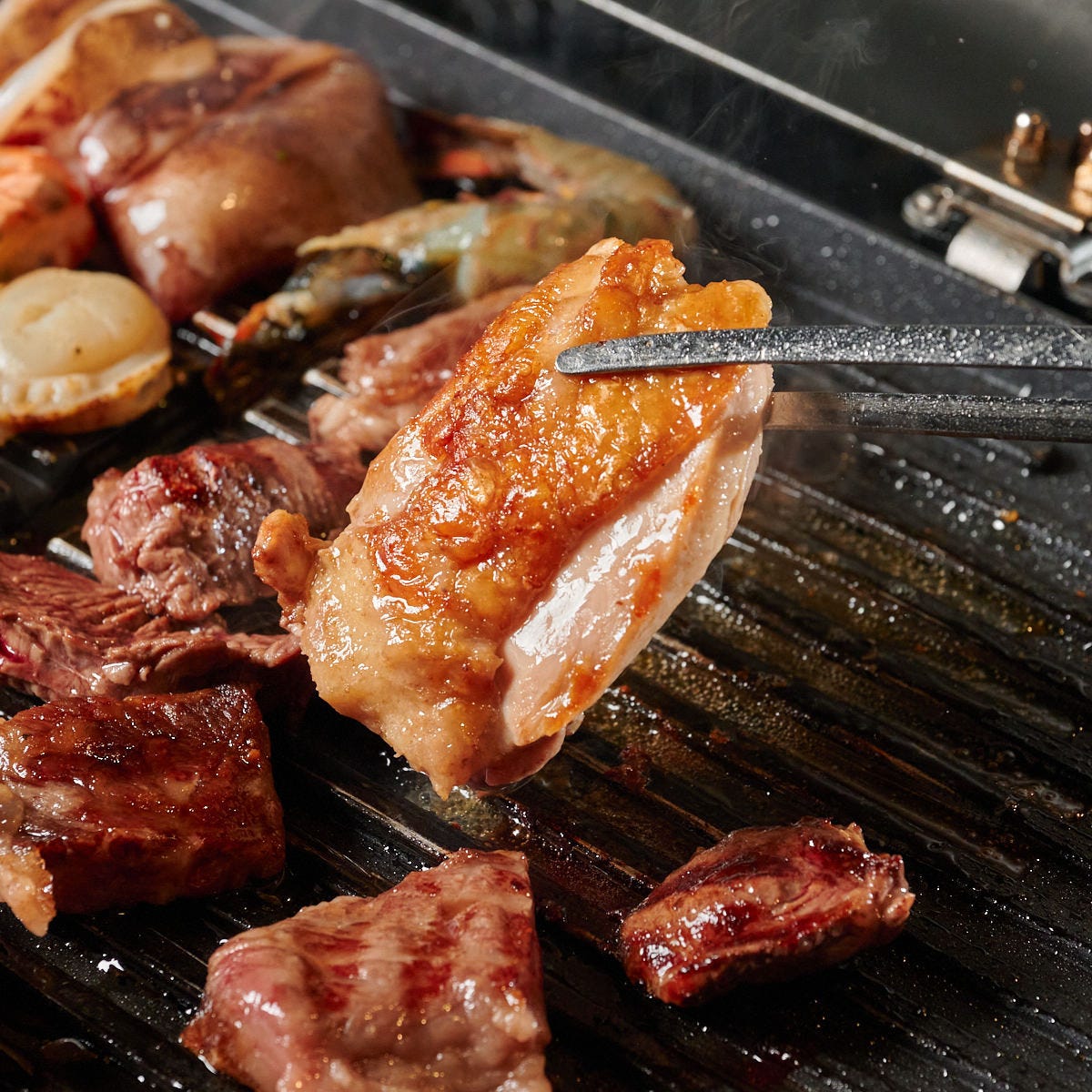 牛肉、豚肉、鶏肉はもちろん、海鮮や野菜、そしてデザートまで多彩なメニューをご提供!