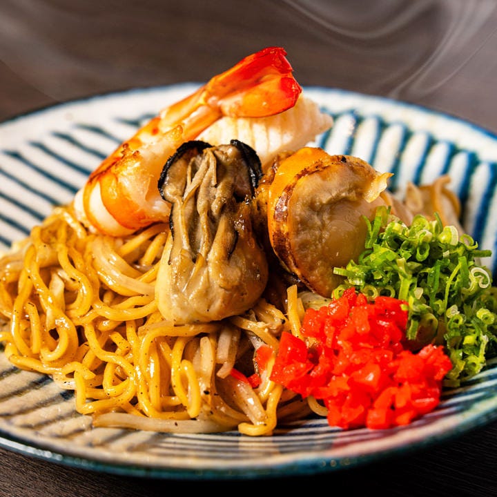 博多一口餃子、牛ホルモン焼き、黒毛和牛ステーキ・鮮魚の盛り合わせ等