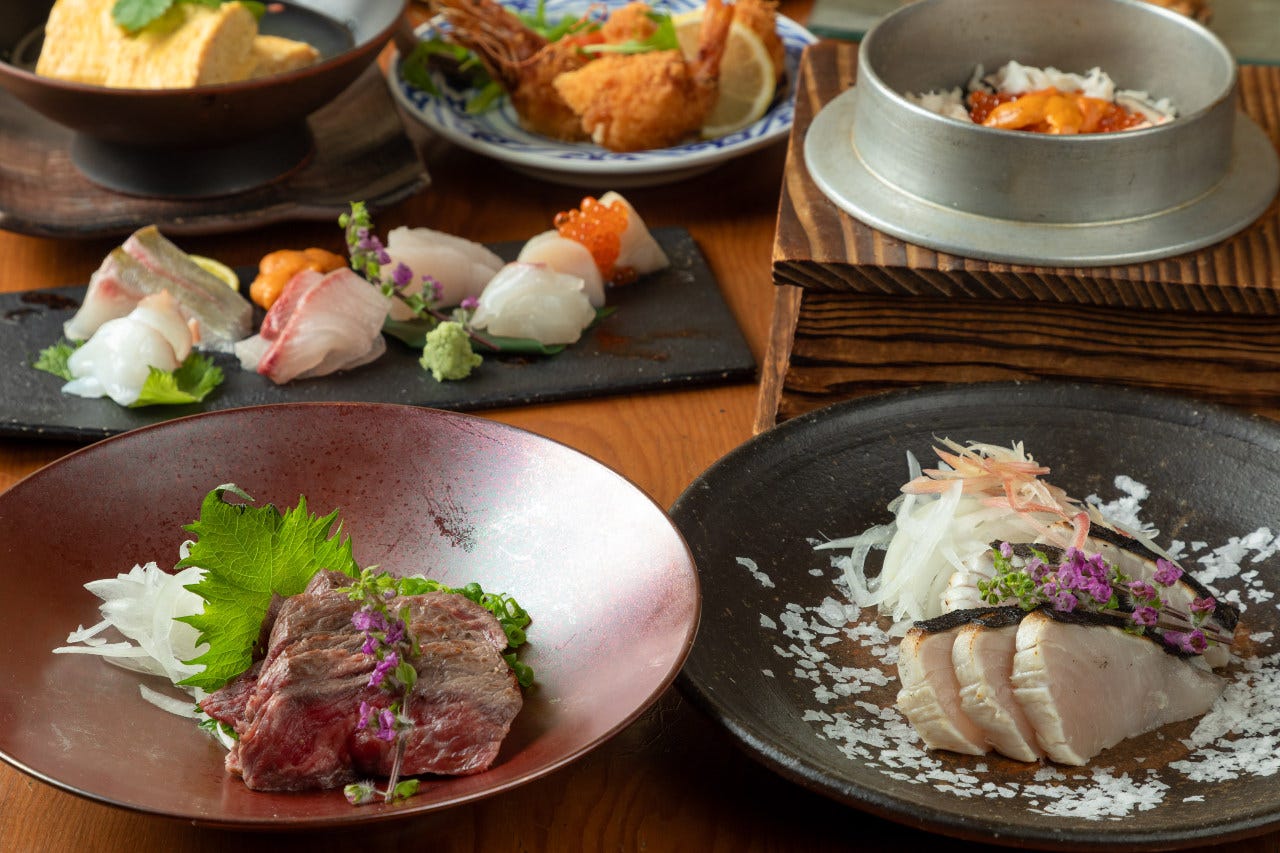 岡山の有名店で修業した店主が作る、季節の食材を取り入れた料理をお手頃価格でお楽しみいただけます。目の前で焼き上げる炭火焼料理・瀬戸内の鮮魚などを使った刺身・旬食材のおばんざいなどを豊富にご用意。オープンキッチンになっておりますので、目の前で調理するライブ感をお楽しみください。