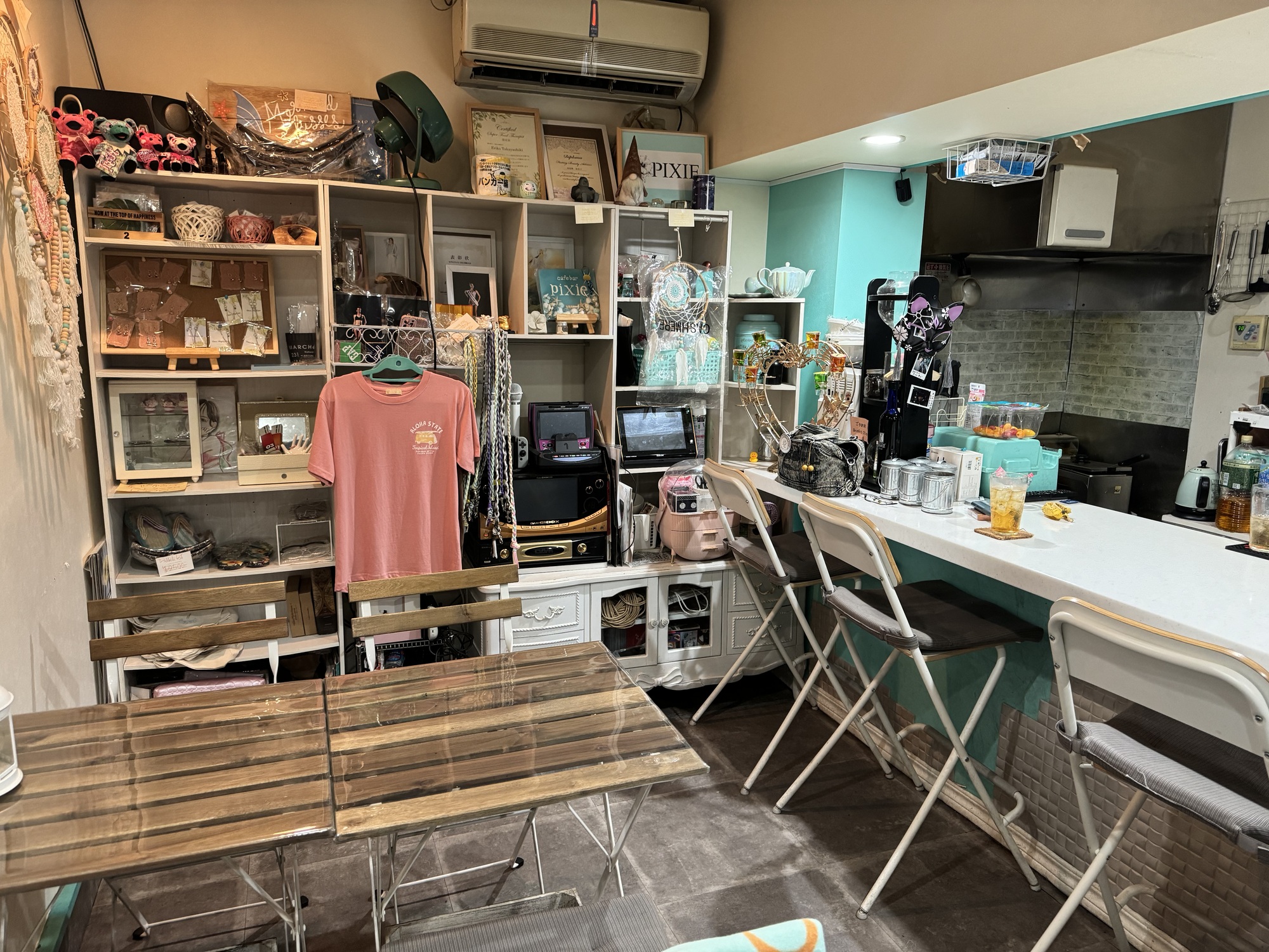 ファンシーでポップなカラーに包まれた癒しの空間―水色の扉が目印のこちらのお店は、昼はカフェでランチ営業(毎週火曜日)、夜はバーとして営業中です。店内にはママお手製のグッズや「かわいい」をぎゅっと詰め込んだ遊び心たっぷりのインテリアがいっぱい。のんびり、そして楽しい時間を過ごせるよう心を込めてお迎えします。カラオケも完備しているので、友達同士でもお一人様でも、とっておきのひとときをお楽しみください。