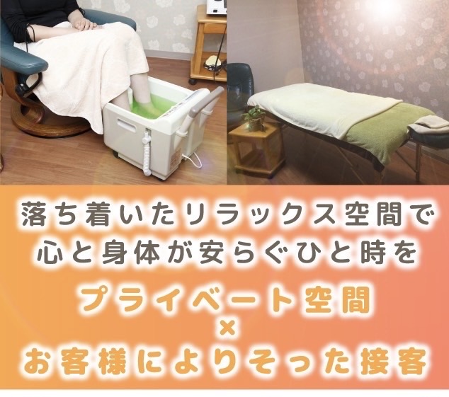 ご予約専用のアットホームなサロンで日常のお疲れや首、肩こり・足のむくみなどを解消し、